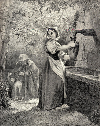 « Aj ʒe, mi bun mata, » de bel ʒika dezì. Id, spulan suprù ci krug, ce copì vod in de maj bel sta de fonti, id prosetì ja co, talvos superan de krug, pote ce moz pivo maj lezim. Pos avo piven, de bun ʒina dezì co : « Vu se sa bel, sa bun id sa kortic, te i moz ne perveno ma davo vo u dav. » Par ce sì u feja we avì nemen de form u pavri vikiʒina, po vizo tis ko itev de bunad id kortij da ʒiku. « I dav vo wim u dav » de feja dezì pro, « te be jaki vord wen vu ve dezo, o u flor o u prizic kam ve veno us vi muk. »